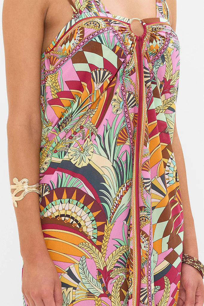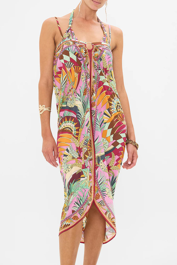 The Giza Goddess Ring Trim Long Sarong depicts a retro inspired geometric scene of lush desert palms in rich tones of luscious greens and lilacs. able to be worn as a skirt or a dress, this luxury sarong features a custom ring detail and removable adjustable straps. Adorned with shimmering crystals this ;lavish beach cover up exudes signature CAMILLA resort wear opulence. Explore more from the House Of The Sun collection.