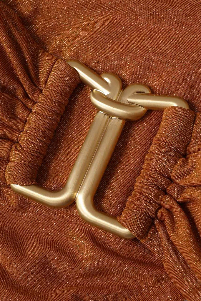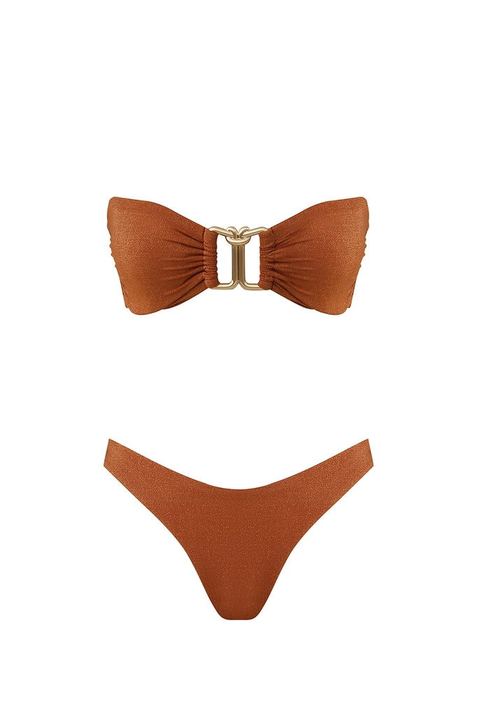 The Daylight Metallic Trim Bikini in Toffee from our Resort Swim 2026 Collection. A lycra bikini set featuring a wire knot detail, gathering at the bust, adjustable straps and boning in the bra.