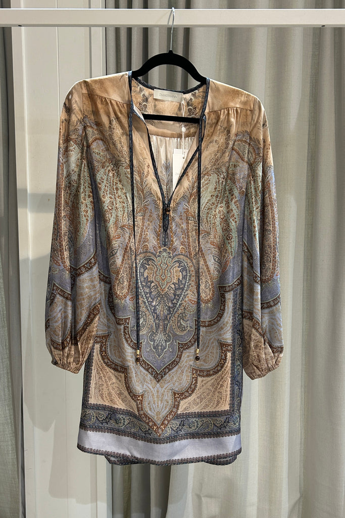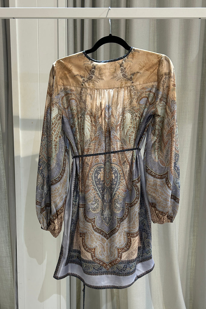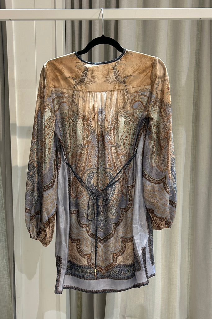 The Wanderlust Tunic in L from our Resort Swim 2026 Collection. A lightweight silk mini dress tunic featuring a plunging V-neckline, long sleeves and partial side splits, finished with a waist belt that can be worn tied around or at back in bow for a relaxed tunic look.