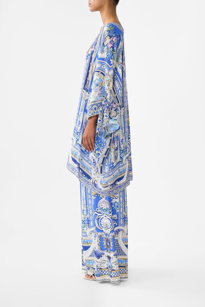 The Ottoman Opulence Tie Sleeve Short V Neck Kaftan is a handcrafted silhouette designed by our in house artisans. Reimagined in an exclusive limited edition print, this short kaftan is cut in a relaxed fit and falls to a playful short hemline. It features a softly plunging V neckline and ties at the sleeves, adding a touch of detail to this breezy, sun-ready piece.