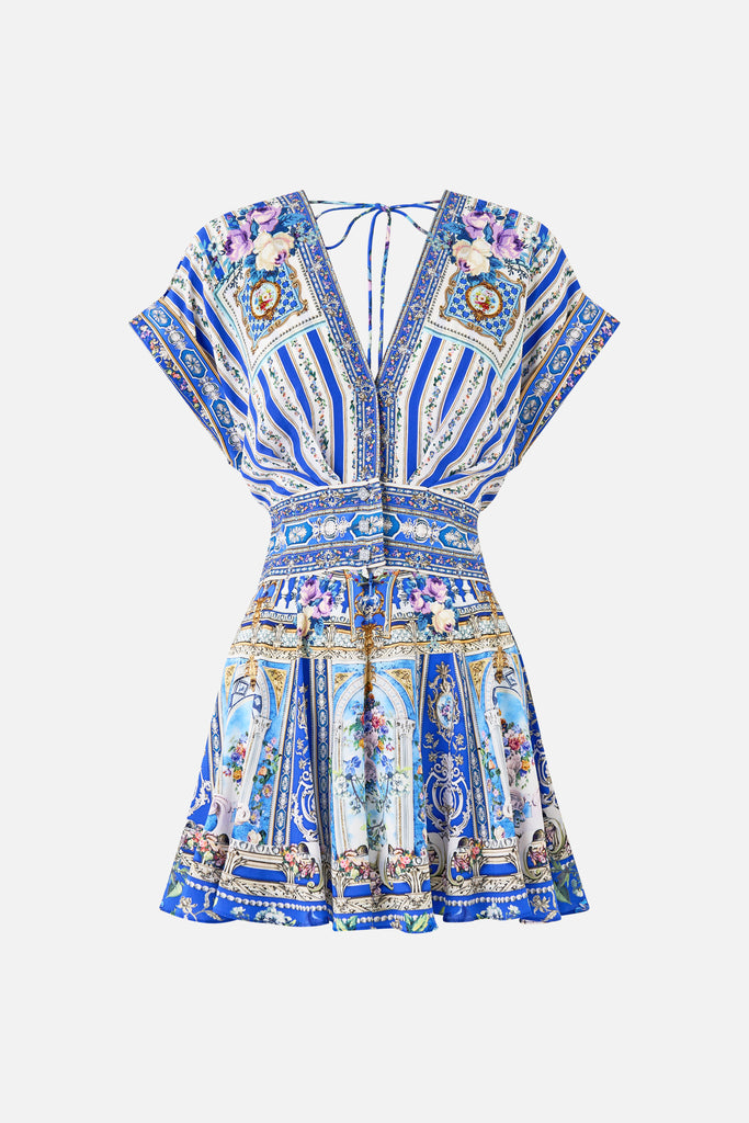 The Ottoman Opulence Button Waist Playsuit is a handcrafted silhouette designed by our in house artisans. Reimagined in an exclusive limited edition print, this playsuit features a button front waistband that is framed by a V neckline that meets an elasticated back for versatility. Its neck ties are decorated with tassels and intricately placed crystal embellishments add luminous detail.