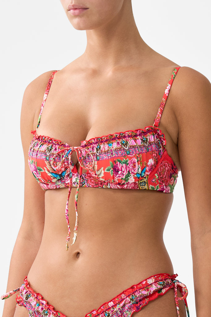 The Heirloom Empire Ruched Cup Underwire Bikini Top With Front Tie is a handcrafted silhouette designed by our in house artisans. Reimagined in an exclusive limited edition print, our underwire bikini top is designed with a B to C cup in mind. Complete with removable pads, adjustable yet convertible straps offer a bespoke fit while ruched cup detailing and a tie front finish to this beautiful balconette bikini.