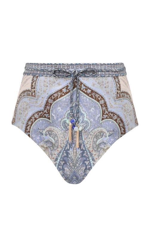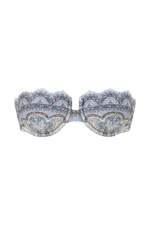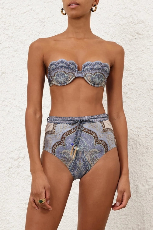 The Wanderlust Scallop Balconette and High Waist Pant in Tapestry Blue Multi bikini set from our Resort Swim 2026 Collection. A balconette bandeau bikini top constructed from form-fitting Italian lycra featuring removable and adjustable seamless straps and scalloped trim. Paired with the high waisted bikini pant, constructed from form-fitting lycra featuring full bottom coverage and a removable rouleau waist belt.