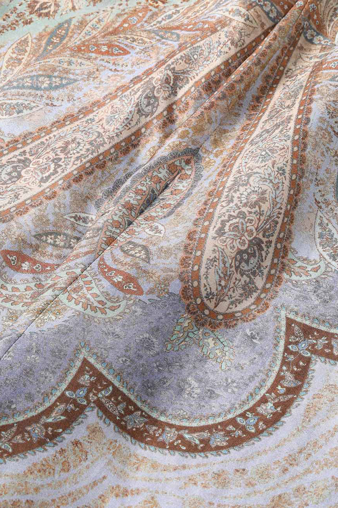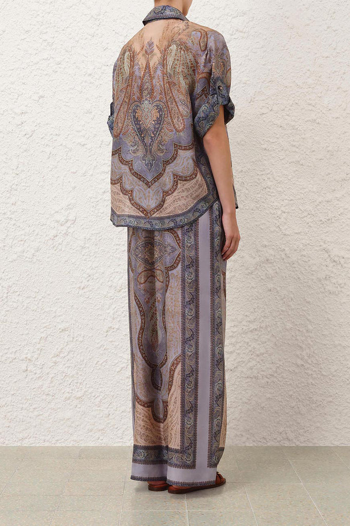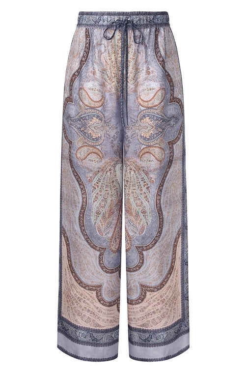 The Wanderlust Relaxed Pant in Tapestry Blue Multi from our Resort Swim 2026 Collection. A silk habutae mid-rise pant featuring a relaxed silhouette, bold placement print and a drawstring waist.
