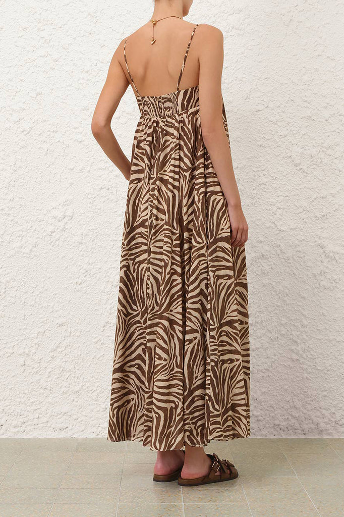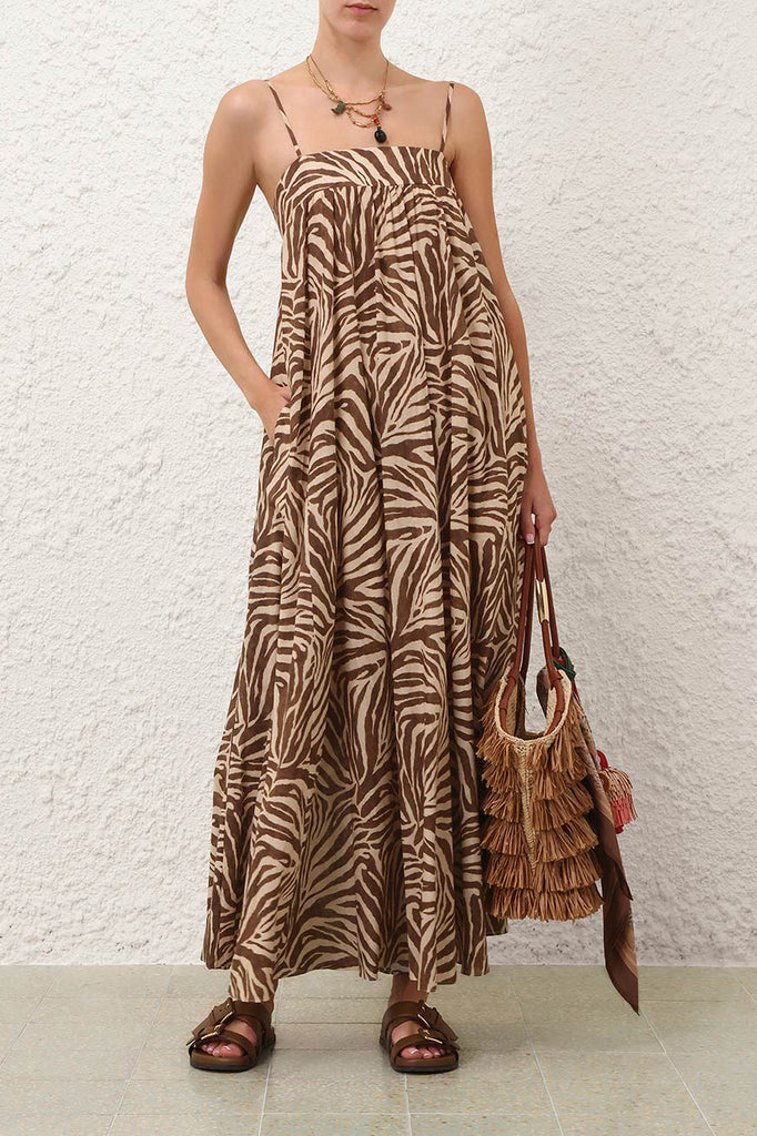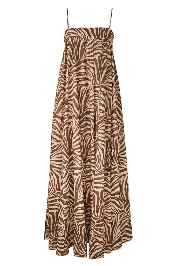 The Wanderlust Maxi Dress in Zebra from our Resort Swim 2026 Collection. A cotton maxi dress featuring a square neckline, adjustable straps, finished with an invisible centre back zip closure and heavy gathering throughout.