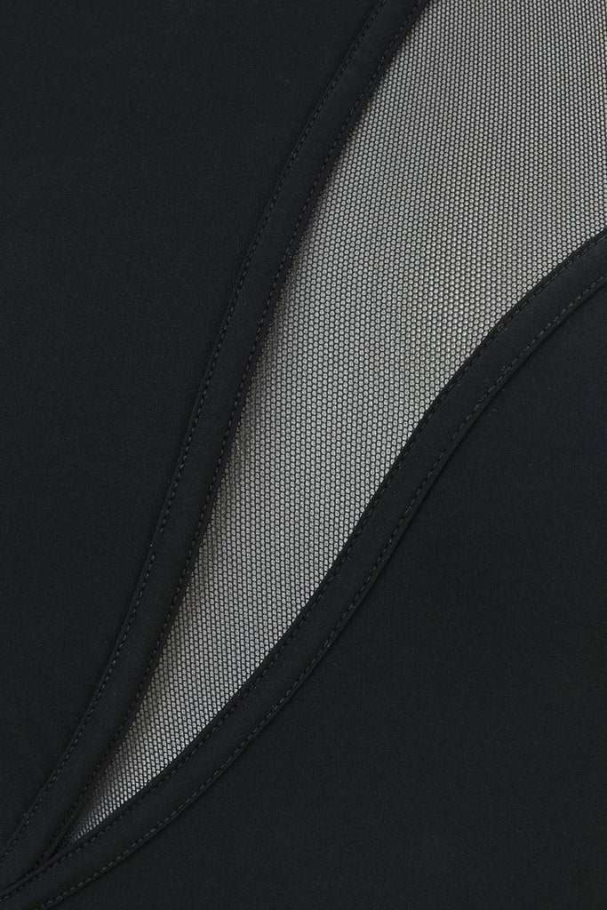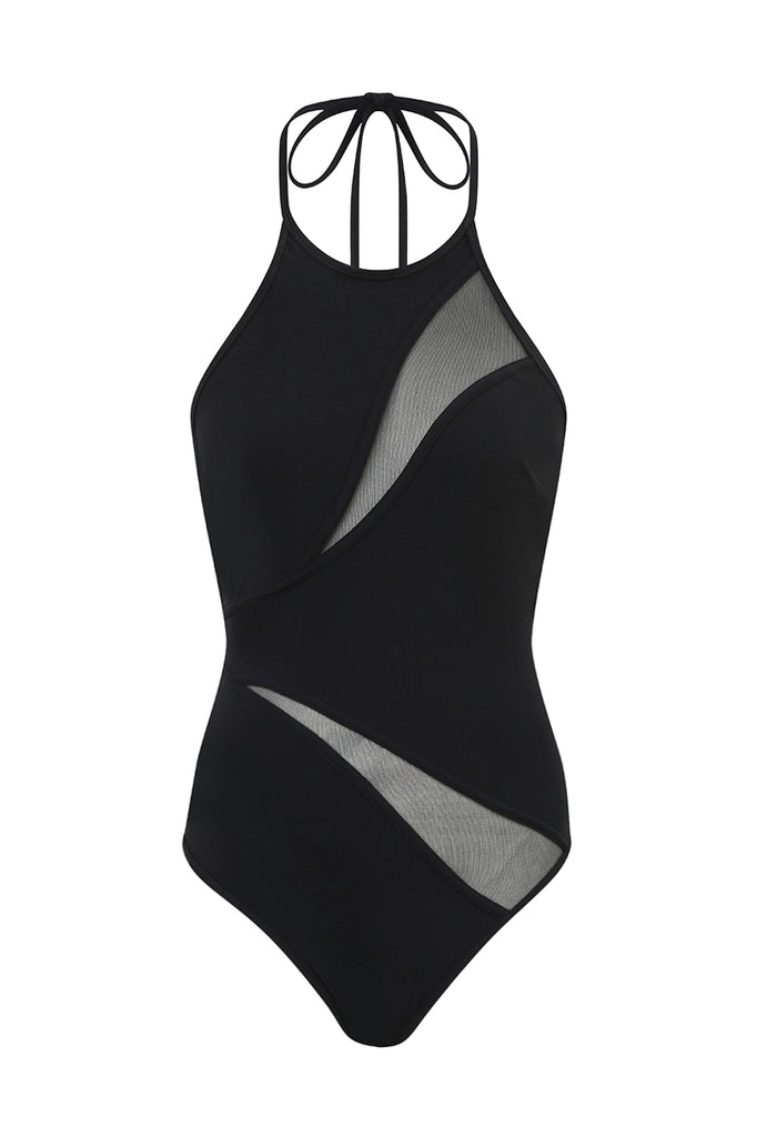 The Wanderlust Spliced Mesh 1PC in Black from our Resort Swim 2026 Collection. A lycra one piece featuring a high halter neckline, medium bottom coverage and mesh panelling through the bodice.
