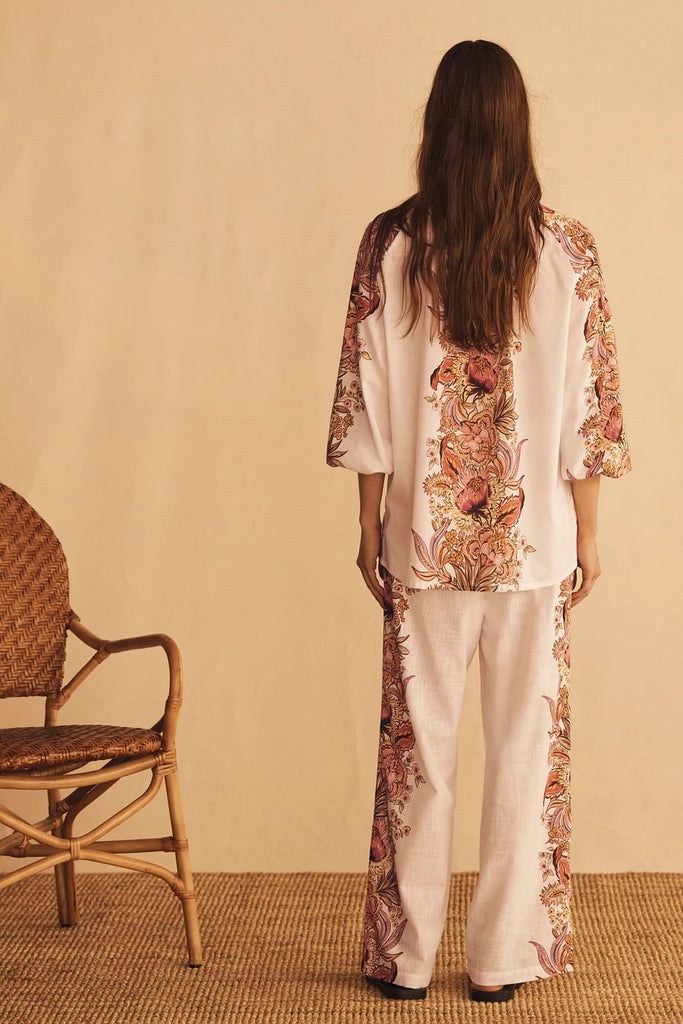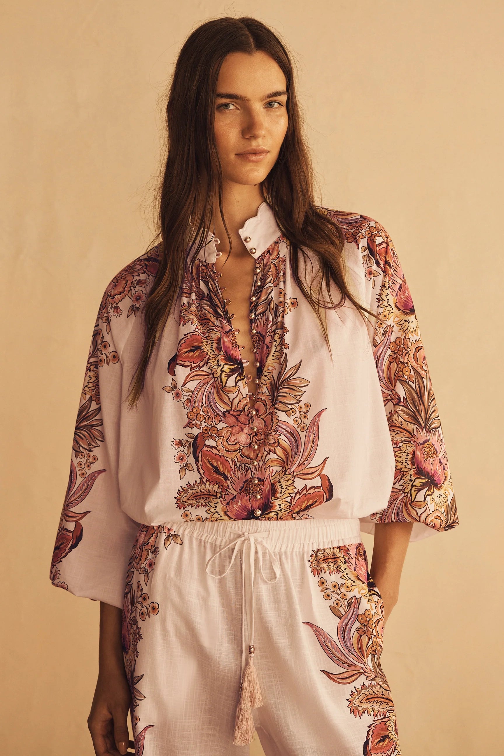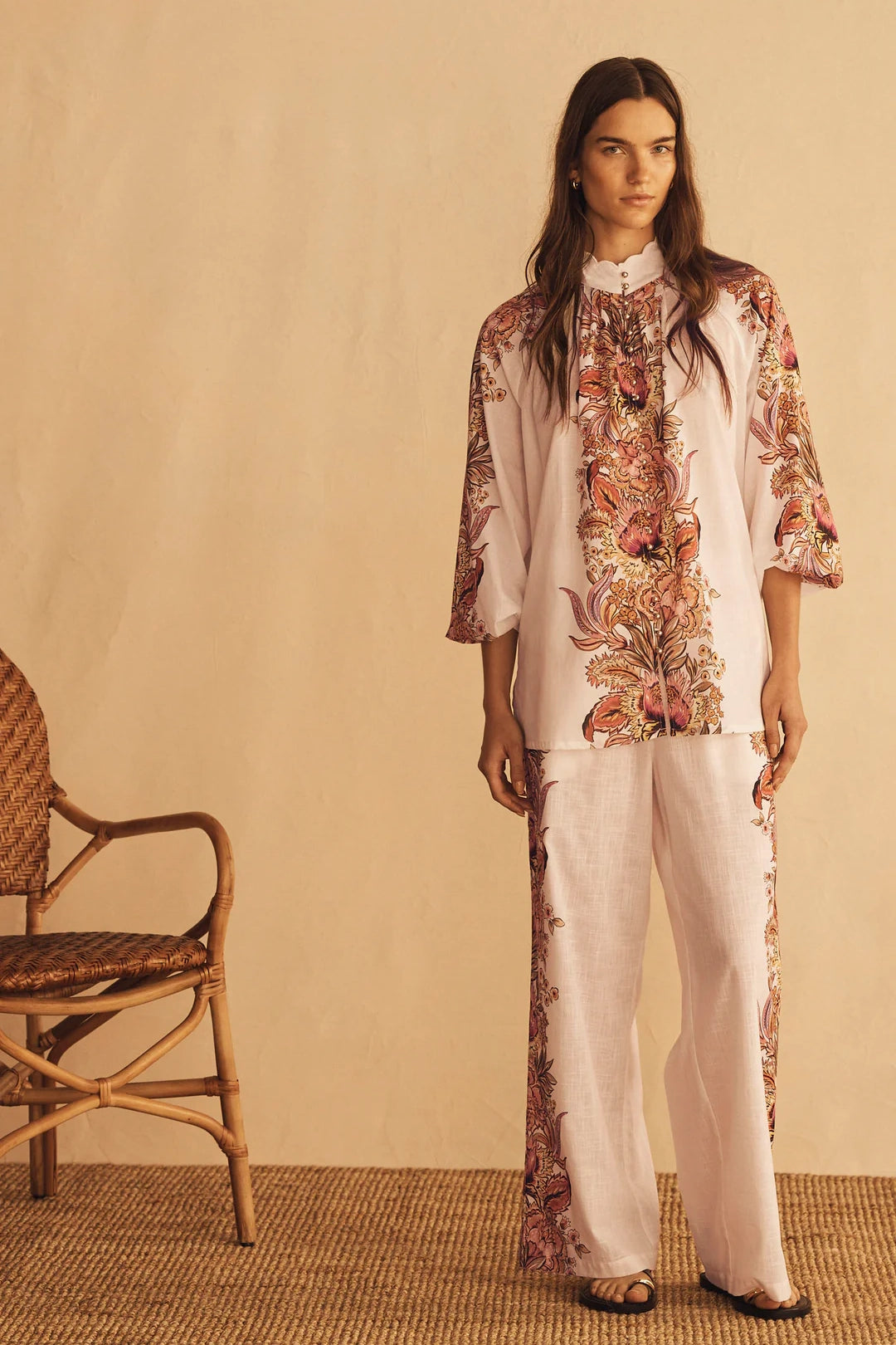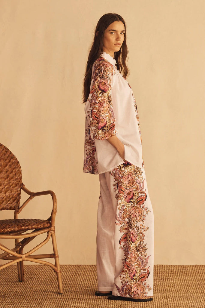BEL FIORE TRELLIS is a celebration of nature’s beauty. Exotic florals unfold within a delicate lattice panel. Warm pinks, soft lilacs, and muted natural tones bloom against a serene coconut base, balancing structure with graceful beauty.
