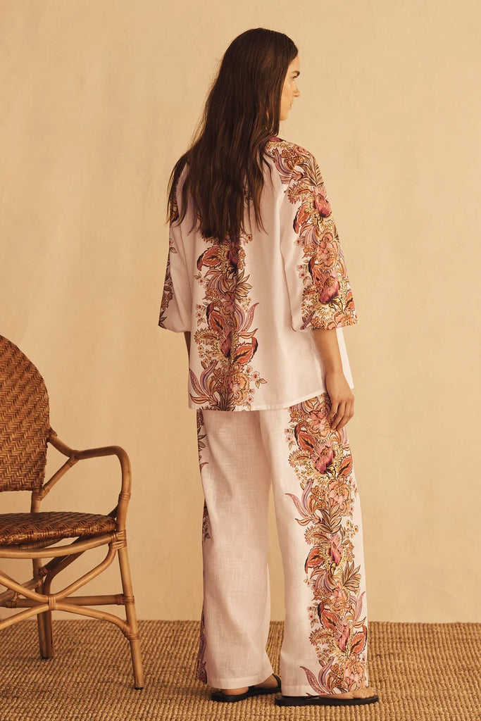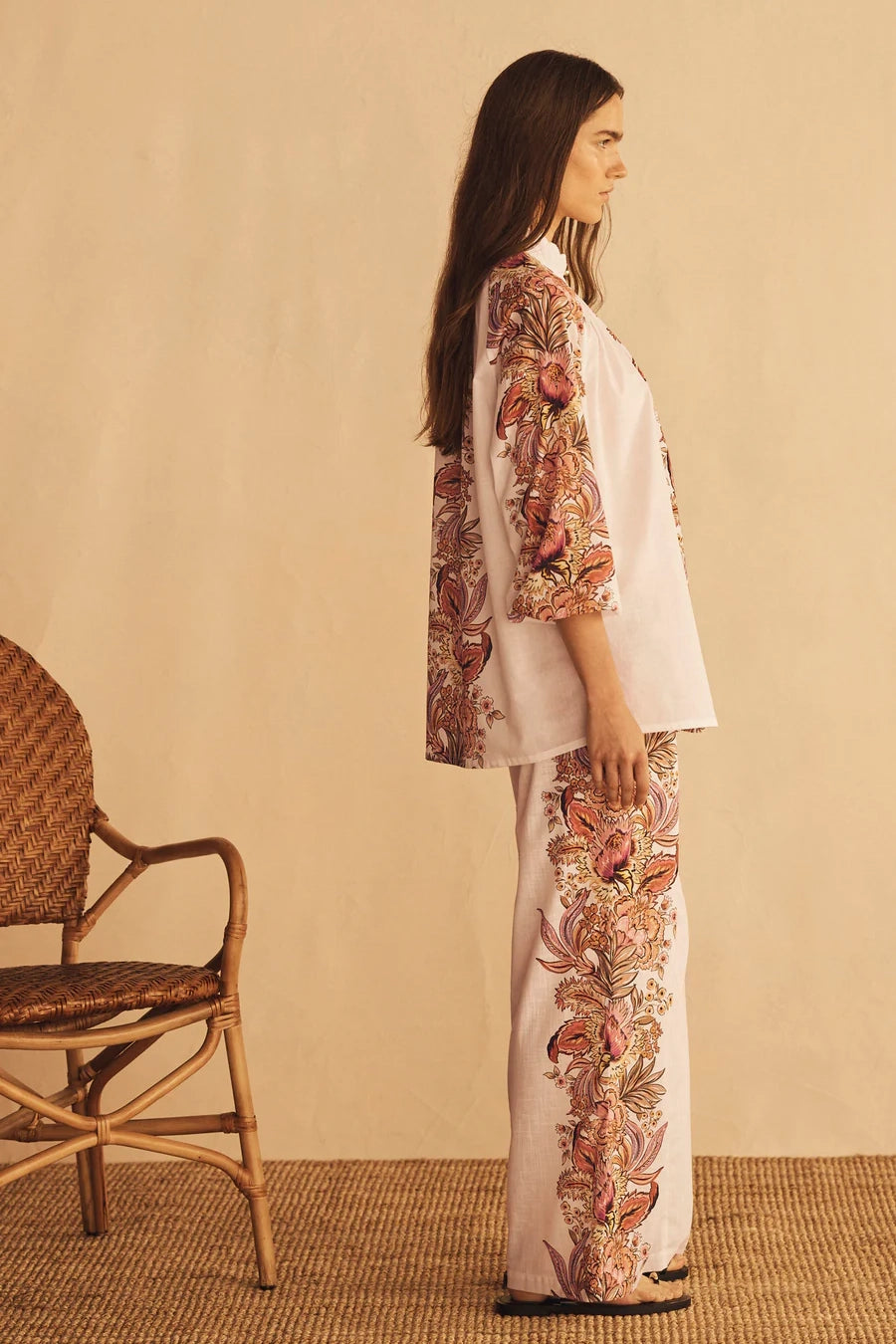 BEL FIORE TRELLIS is a celebration of nature’s beauty. Exotic florals unfold within a delicate lattice panel. Warm pinks, soft lilacs, and muted natural tones bloom against a serene coconut base, balancing structure with graceful beauty.