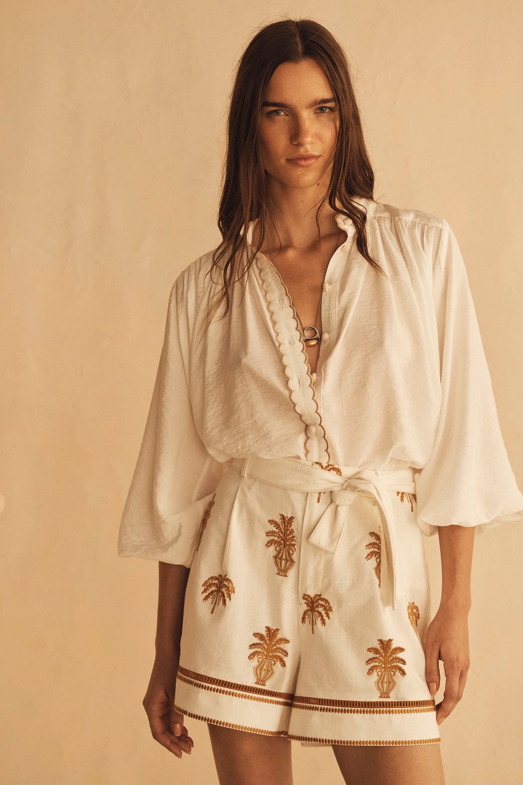- Soft neutral contrasting scallop trim front placket