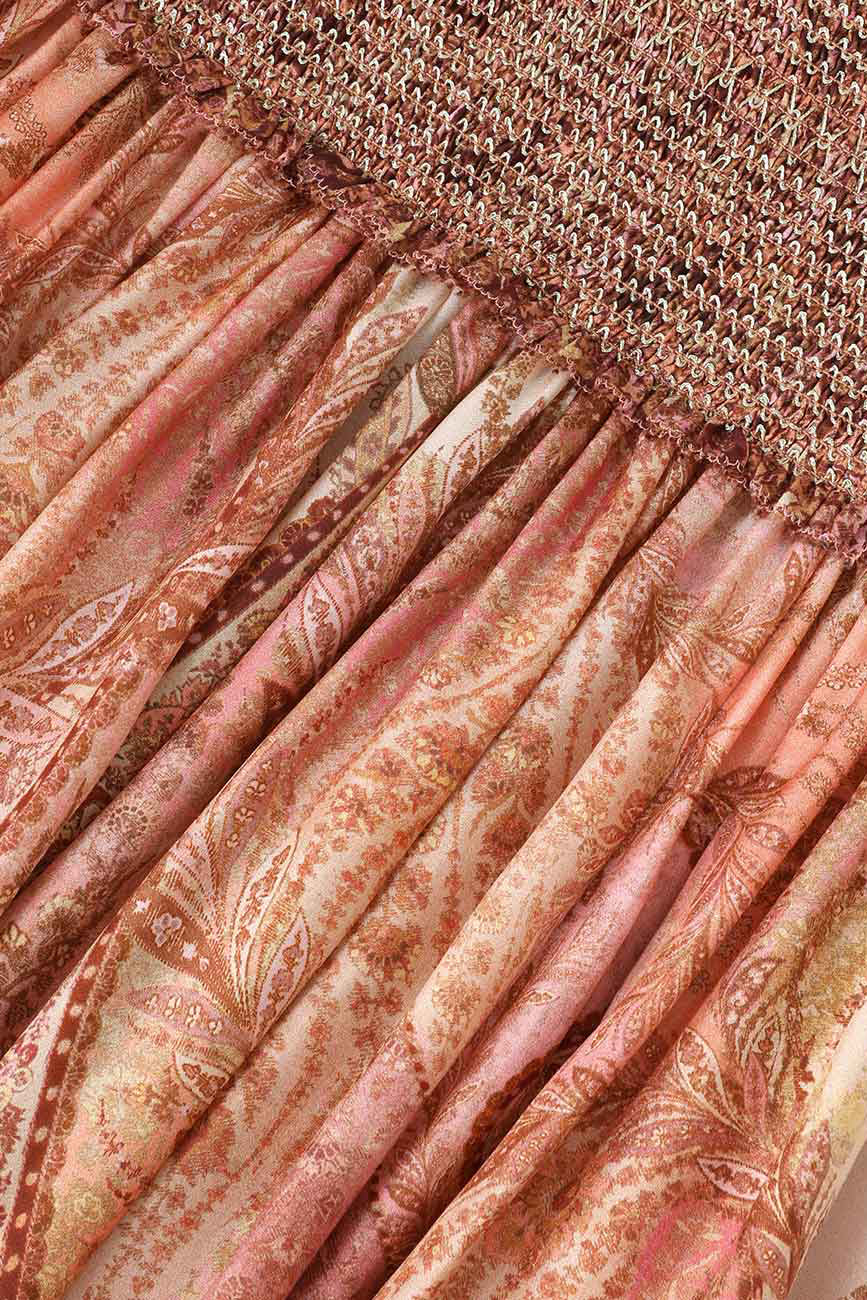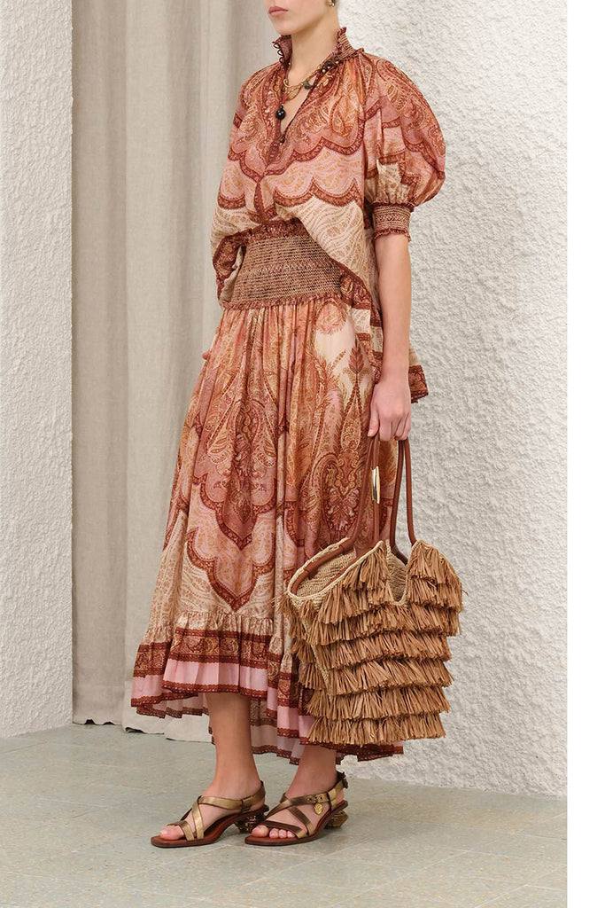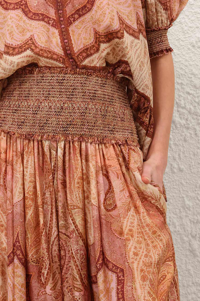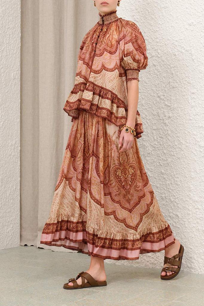 The Wanderlust Frill Maxi Skirt in Tapestry Burgundy Multi from our Resort Swim 2026 Collection. A silk maxi skirt featuring an elasticated waistband, side seam pockets, finished with heavy pleats and a frilled hem.