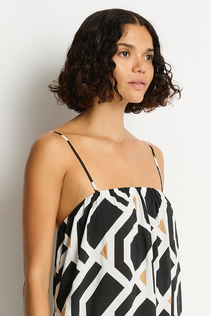 Step into the world of refined elegance with the COSTA collection, where sophisticated geometric designs in crisp black and white are subtly highlighted with touches of sunbaked tobacco. Styled with luxurious gold hardware, each piece perfectly complements the warm tones of this striking black and white swimwear collection.