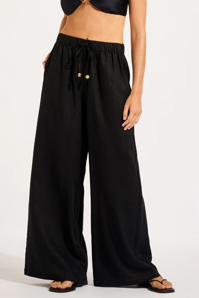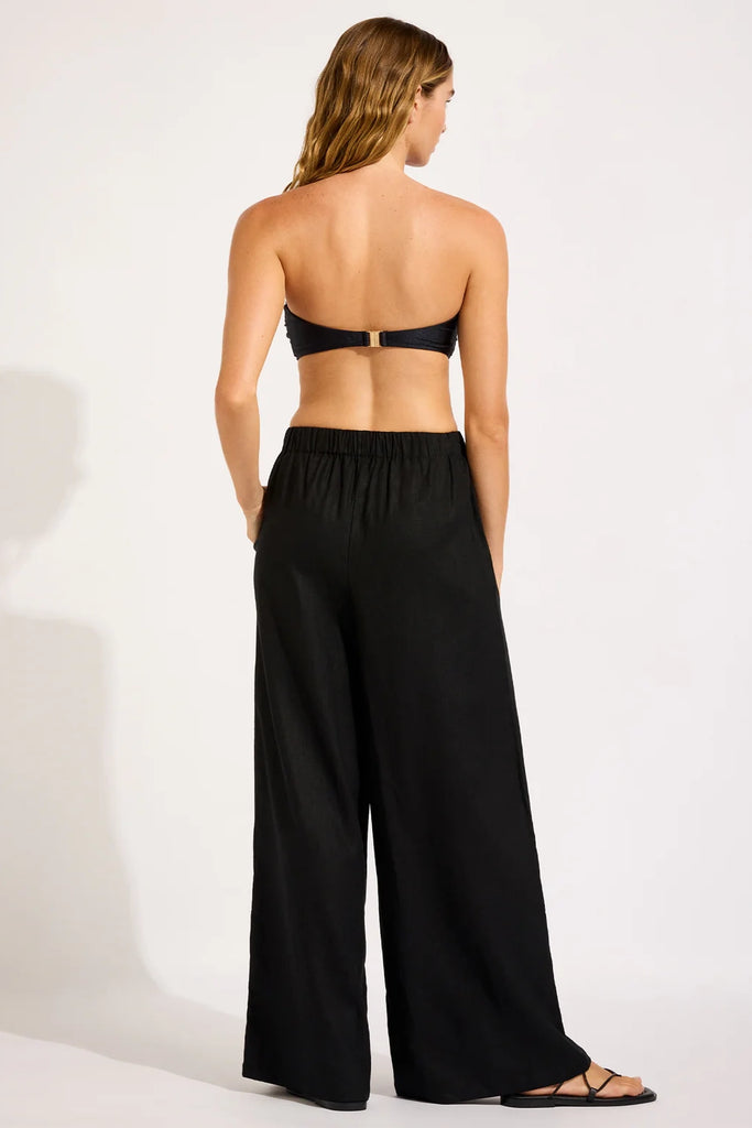 The August apparel collection beautifully complements the Coastline and Palermo swim stories. A standout look would be this beautiful wide-leg pant paired with an inverse button-up shirt featuring longline cuffs, offering a classic yet artistic statement.